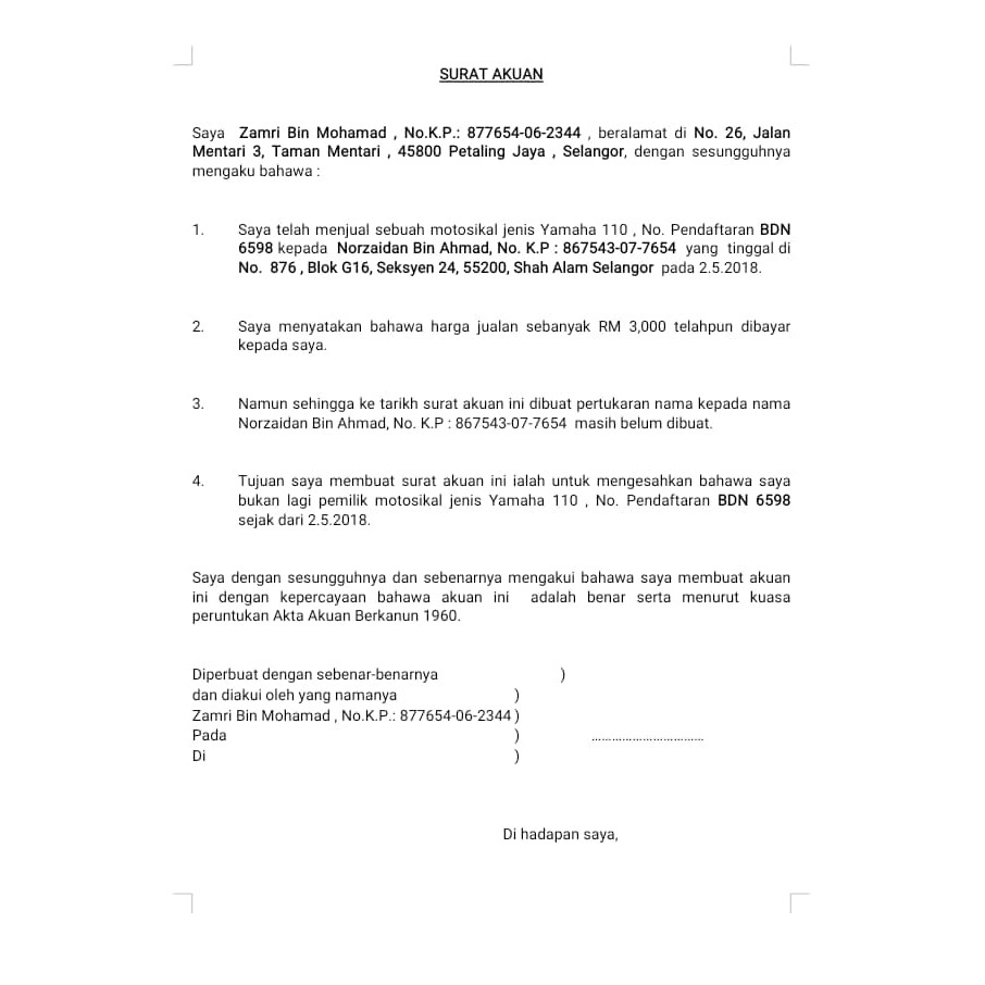 Ini Adalah Contoh Surat Akuan Yang Diterima Pakai Oleh Semua Pesuruhjaya Sumpah Mana Mana Surat Akuan Yang Tidak Mengikut Format Seperti Di Dalam Gambar Adalah Pesuruhjaya Sumpah Notari Awam Plaza