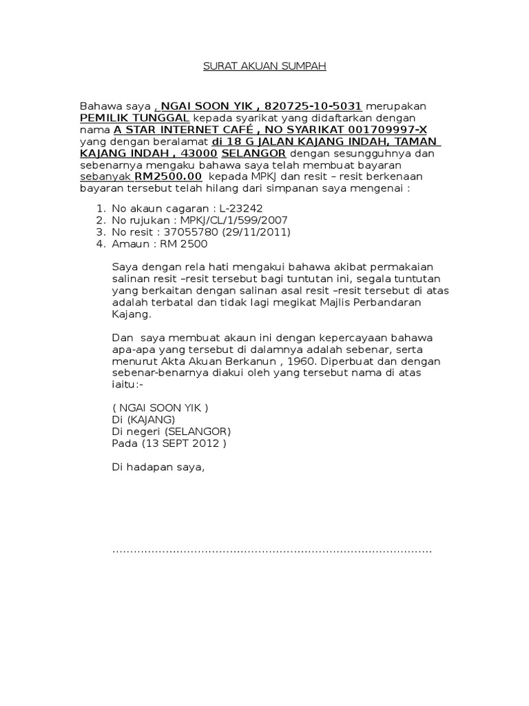 Pesuruhjaya Sumpah Malaysia Putrajaya Contoh Surat Akuan Sumpah Hilang Resit Facebook